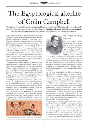 The Egyptological afterlife of Colin Campbell Colin Campbell made his name with early publications of celebrated Theban tombs, but his facsimile paintings from some of them are largely unknown. Angela McDonald and Sally-Anne Coupar have been working to conserve the paintings and to uncover the history behind them. Three years ago, while foraging through the collection of Glasgow University’s Hunterian Museum to identify items that might inspire students, we came across a series of thirteen facsimile paintings that had been quietly gathering dust in storage. The name of the artist – the Reverend Colin Campbell – was immediately familiar as the author of several important studies, including a critical re-appraisal of a contemporary publication of the tomb of Nefertari (1909), the first – and until recently, only – detailed description of the scenes and texts in Menna’s tomb (1910), and a pioneering photographic publication of the complex divine birth scenes in Luxor Temple (1912). However, so far as we knew, his collection of paintings was relatively unknown. Attracted by the paintings’ vivacity, we decided to make them the focus of a summer lecture in Glasgow in 2009. The lecture, which culminated in a dramatic unrolling of three of the paintings, excited a lot of interest, not only in the Theban tomb scenes, captured life-size and in colour on the canvases, but also in the artist himself. We were asked about how Campbell had managed to make his paintings, what materials he had used, whether he had worked in the tombs themselves, where he had studied Egyptology (never an easy task in Scotland!), and so on. Since the paintings were in a rather fragile state, we decided that conservation should be a priority, but we also wanted a better understanding of the man behind them who, after an illustrious ecclesiastical career, had re-fashioned himself into an Egyptologist. Born in Campbeltown, Argyllshire, in 1848, Colin Campbell was the son of a local tailor. He quickly distinguished himself as a student at Glasgow University, winning some 35 academic prizes for compositions, oral readings from Latin and Greek, and performance
