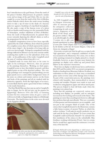 In 1925 Campbell wrote to Glasgow University to offer its museum part of his antiquities collection (comprising, he said, several ostraca, fragments of the Book of the Dead, and ‘a few genuine antikas’). Almost as an afterthought, he added ‘I venture also to offer some facsimile reproductions in colours of scenes from Tomb Chapels which I was permitted to make by the kindness of the late Sir Gaston Maspero, Chief of the Service des Antiquités of Egypt’. University records note that his gift was accepted with ‘high appreciation’, and a temporary exhibition of them was mounted in the Hunterian. For a time, two or three of the paintings remained on display pinned to a board. Gradually, however, as space became more limited, the paintings on display were rolled up and joined their fellows in the museum’s storerooms. Their time on display wreaked some havoc and between July 2009 and December 2010, an extensive programme, thanks to funding from Museums Galleries Scotland, was undertaken in three phases to clean away accumulated grime and to reverse some of the damage done to them. As part of the conservation process, the paintings were relaxed with humidity, then tension-dried to remove creasing and wrinkles. Repairs were made to tears and weaknesses using Japanese paper and wheat starch paste. This process helped to heal old holes made when the paintings were pinned up. Now that the paintings are conserved, various uses, including new displays, are possible, and we anticipate increased use for teaching and research in the future. The paintings are more than a teaching tool, however, although they perform that task marvellously. They are a reminder of what passion and determination can accomplish - and not just in the energetic blush of youth. One of the ostraca that Campbell donated to the Hunterian contains a little hymn in praise of ancient Thebes, in which the author exclaims: ‘I will make for myself a productive stay on earth until the last days of my lifetime!’ It is not certain that Campbell could read hieratic himself – he entrusted the first translations of his ostraca to the redoubtable Alan Gardiner, working with Jaroslav Černý - but it is certain that he would have appreciated the sentiment: it was the story of his later life. q Angela McDonald teaches Egyptology to adult learners at the University of Glasgow and Sally-Anne Coupar is the Curator of Archaeology at the Hunterian Museum. Photographs courtesy of the Hunterian Museum, Glasgow University.