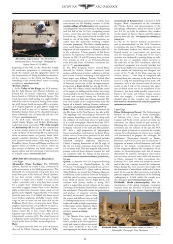 Kom Firin: A study season was undertaken by the BM team, led by Neal Spencer (see also p.44). The typology and chronological framework for the ceramic assemblages were refined, along with the collation of small finds ahead of publication of a second monograph. Material from the 200708 Citadel excavations was re-assessed, proving to be largely restricted to the sixth and fifth centuries BC, with a high proportion of ‘pigeon-pots’ (open-mouthed jars with holes in the base). These vessels seem to have been produced in the small kiln excavated in 2008. Other material includes imported transport amphorae (Phoenician, Chian). Ongoing destruction of the N edge of the site was noted, exposing a long stretch of the LP enclosure wall. This was mapped and planned; pottery retrieved from deposits beneath the wall are consistent with the dating of this temenos. www.britishmuseum.org/research/research_projects/kom_ firin.aspx.