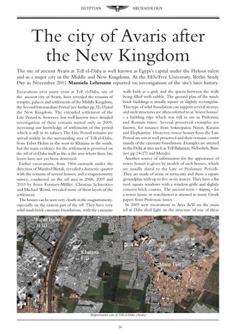 The city of Avaris after the New Kingdom The site of ancient Avaris at Tell el-Daba is well known as Egypt’s capital under the Hyksos rulers and as a major city in the Middle and New Kingdoms. At the EES/Free University, Berlin Study Day in November 2011 Manuela Lehmann reported on investigations of the site’s later history. walls built as a grid, and the spaces between the walls being filled with rubble. The ground plan of the mudbrick buildings is usually square or slightly rectangular. This type of solid foundation can support several storeys, and such structures are often referred to as ‘tower houses’ - a building type which was still in use in Ptolemaic and Roman times. Several preserved examples are known, for instance from Soknopaiou Nesos, Karanis and Elephantine. However, tower houses from the Late Period are not as well preserved and their remains consist mainly of the casemate foundations. Examples are attested in the Delta at sites such as Tell Balamun, Nebesheh, Buto (see pp.14-17) and Mendes. Another source of information for the appearance of tower houses is given by models of such houses, which are usually dated to the Late or Ptolemaic Periods. They are made of stone or terracotta and show a square groundplan with up to five or six storeys. They have a flat roof, square windows with a window grille and slightly concave brick courses. The ancient term - πύργος - for a tower house or watchtower is attested in many Greek papyri from Ptolemaic times. In 2009 new excavations in Area A/II on the main tell at Daba shed light on the structure of one of these