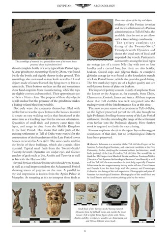 q Manuela Lehmann is a member of the Tell el-Daba Project of the Austrian Archaeological Institute, and a doctoral candidate at the Free University, Berlin, studying the material culture (architecture, small finds, pottery) of the Late Period in Tell el-Daba. She would like to thank her PhD supervisor Manfred Bietak, and Irene Forstner-Mßller (Director of the Austrian Archaeological Institute Cairo Branch) as well as all the Tell el-Daba team members for their help, especially Christian Schweitzer for the magnetometry survey in the tell area, David Aston and Pamela Rose for their help with the pottery and Dominique Collon for the dating of the seal impression. Photographs and plans Š Austrian Archaeological Institute. Photographs of the small finds are by Axel Krause and excavation photographs by the writer.