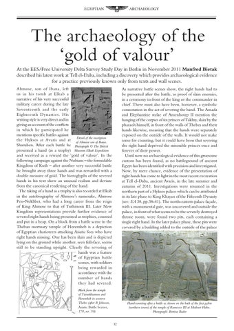 The archaeology of the ‘gold of valour’ At the EES/Free University Delta Survey Study Day in Berlin in November 2011 Manfred Bietak described his latest work at Tell el-Daba, including a discovery which provides archaeological evidence for a practice previously known only from texts and wall scenes. Ahmose, son of Ibana, left us in his tomb at Elkab a narrative of his very successful military career during the late Seventeenth and the early Eighteenth Dynasties. His writing style is very direct and in giving an account of the conflicts in which he participated he mentions specific battles against Detail of the inscription the Hyksos at Avaris and at of Ahmose son of Ibana. Sharuhen. After each battle he Photograph © The British presented a hand (as a trophy) Museum Elkab Expedition and received as a reward the ‘gold of valour’. In the following campaign against the Nubians – the formidable Kingdom of Kush – after another very successful battle he brought away three hands and was rewarded with a double measure of gold. The hieroglyphs of the severed hands in his text show an unusual realism and deviate from the canonical rendering of the hand. The taking of a hand as a trophy is also recorded at Elkab in the autobiography of Ahmose’s namesake, Ahmose Pen-Nekhbet, who had a long career from the reign of King Ahmose to that of Tuthmosis III. Later New Kingdom representations provide further evidence of severed right hands being presented as trophies, counted and put in a heap. On a block from a battle scene in the Theban mortuary temple of Horemheb is a depiction of Egyptian charioteers attacking Asiatic foes who have right hands missing. One has been slain and is depicted lying on the ground while another, seen full-face, seems still to be standing upright. Clearly the severing of hands was a feature of Egyptian battle scenes, with soldiers being rewarded in accordance with the number of hands they had severed.
