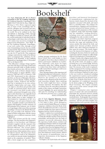jostling amongst institutions for the finest pieces which they could display in their own galleries from those objects exhibited at Petrie’s post-season exhibitions in London. The Glyptotek’s early desire for larger monuments rather than ‘trifling antiquities’ is evident from these letters and Jacobsen’s wealth ensured that Copenhagen could secure a striking collection. These opening chapters relate important and intriguing background information, which is presented in a very straightforward manner. However, the narrative is, on occasion, perhaps overly colloquial and the final section ends somewhat abruptly. More satisfying for the reader might have been a closing summary statement. Nevertheless, this does not detract from the marvellous production quality of this volume and Bagh’s meticulous research highlights the great potential that still exists for enriching our understanding of collections procured over a century ago. ALICE STEVENSON John H Taylor, Egyptian Mummies. British Museum Press, London 2010 (ISBN 978 0 7141 5058 1). Price: £9.99. Released to coincide with the British Museum’s acclaimed temporary exhibition about the Book of the Dead, this publication provides a concise but extensive insight into many aspects of ancient Egyptian funerary beliefs and practices. Chapter 1 explains how mummification was regarded as a means of enabling the deceased to attain the afterlife and thus ensure personal immortality, and describes how the study of mummies can provide information about life expectancy, health, disease, nutrition and embalming techniques which are not generally available in inscriptional or pictorial sources. The author shows how the Egyptian belief in an afterlife was closely associated with a complex interpretation of the human personality, and how their distinctive burial customs, defined by the practice of mummification, were an important demonstration of the Egyptian collective identity. In Chapter 2 Dr Taylor looks at the technical