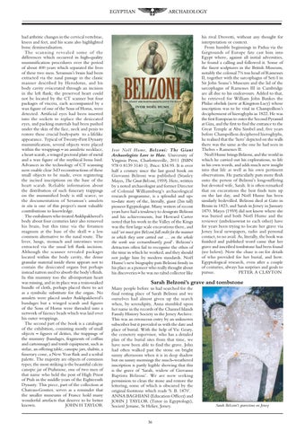 Ivor Noël Hume, Belzoni: The Giant Archaeologists Love to Hate. University of Virginia Press, Charlottesville, 2011 (ISBN 978 0 8139 3140 1). Price: $34.95. It is over half a century since the last good book on Giovanni Belzoni was published (Stanley Mayes, The Great Belzoni, 1959). Here, written by a noted archaeologist and former Director of Colonial Williamsburg’s archaeological research programme, is a splendid and upto-date story of the, literally, giant (2m tall) pioneer Egyptologist. Many writers of recent years have had a tendency to denigrate Belzoni and his achievements, but Howard Carter noted that his work in the Valley of the Kings was the first large scale excavations there, and said ‘we must give Belzoni full credit for the manner in which they were carried out … on the whole the work was extraordinarily good’. Belzoni’s detractors often fail to recognise the ethos of the time in which he worked, and they should not judge him by modern standards. Noël Hume’s new biography puts Belzoni firmly in his place as a pioneer who really thought about his discoveries – he was no rabid collector like