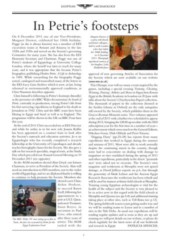 In Petrie’s footsteps On 8 December 2011 one of our Vice-Presidents, Margaret Drower, celebrated her 100th birthday. Peggy (as she is always known) was a member of EES excavation teams at Armant and Amarna in the late 1920s and 1930s and served on the Society’s governing Committee for many years. She has also been the EES Honorary Secretary and Chairman. Peggy was one of Petrie’s students of Egyptology at University College London, where she herself was later to teach for many years, and it was appropriate that she became Petrie’s biographer, publishing Flinders Petrie. A Life in Archaeology in 1985. While researching for the biography Peggy sorted, catalogued and transcribed many of the letters in the EES Lucy Gura Archive which is now, at last, being rehoused in environmentally approved conditions, as Chris Naunton describes opposite. Chris himself is following in Petrie’s footsteps (literally) as the presenter of a BBC Wales documentary In Search of Petrie, currently in production, tracing Petrie’s life from his first surveying expeditions in England to his death in Jerusalem in 1942. Chris and the BBC team have been filming in Egypt and Israel as well as in England. The programme will be shown in the UK on BBC Four later this year. At the end of 2011 Chris succeeded me as EES Director and while he settles in to his new role Joanna Kyffin has been appointed on a contract basis to look after the Society’s outreach and education activities. Jo is an Egyptologist who has recently completed a research fellowship at the University of Copenhagen and already teaches hieroglyphs classes for the Society. She also gave a talk on her research speciality, magical texts, at the Study Day which preceded our Annual General Meeting on 10 December 2011 (see opposite). At the AGM members elected Alan Lloyd, our former Chairman, to serve as President of the Society. Alan will need no introduction to EES members, nor to the wider world of Egyptology, and we are all pleased that he is willing to continue to help promote the Society. Members also elected a new Chair, Aidan Dodson, to succeed Karen Exell, following her appointment to a post at UCL Qatar, and a new Treasurer, Susan Royce, in succession to Paul Cove, who retired The BBC Wales TV crew setting up to film at after three years of Tanis, the first site excavated by Petrie for the service. The AGM Egypt Exploration Fund ended with the