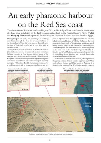 An early pharaonic harbour on the Red Sea coast The first season of fieldwork conducted in June 2011 at Wadi al-Jarf has focused on the exploration of a large-scale installation on the Red Sea coast dating back to the Fourth Dynasty. Pierre Tallet and Gregory Marouard report on the discovery of the oldest harbour remains found in Egypt. During the past ten years, our knowledge of seafaring expeditions through the Red Sea towards the Sinai or the distant land of Punt has been increased considerably because of fieldwork conducted at port sites such as Mersa Gawasis. Along the Gulf of Suez, excavations by the French Institute (IFAO) have provided evidence of another important harbour complex at Ayn Sukhna (60km south of the town of Suez) which was used during the Old and Middle Kingdoms to reach the mining zones of copper and turquoise exploitation in south Sinai. Ayn Sukhna saw a peak of activity during the Fifth and the Twelfth Dynasties, as confirmed by several inscriptions left by pharaonic expeditions, and as a