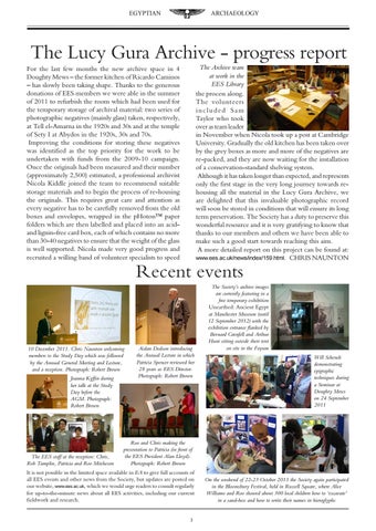 The Lucy Gura Archive - progress report The Archive team at work in the EES Library the process along. The volunteers included Sam Taylor who took over as team leader in November when Nicola took up a post at Cambridge University. Gradually the old kitchen has been taken over by the grey boxes as more and more of the negatives are re-packed, and they are now waiting for the installation of a conservation-standard shelving system. Although it has taken longer than expected, and represents only the first stage in the very long journey towards rehousing all the material in the Lucy Gura Archive, we are delighted that this invaluable photographic record will soon be stored in conditions that will ensure its long term preservation. The Society has a duty to preserve this wonderful resource and it is very gratifying to know that thanks to our members and others we have been able to make such a good start towards reaching this aim. A more detailed report on this project can be found at: www.ees.ac.uk/news/index/159.html. CHRIS NAUNTON