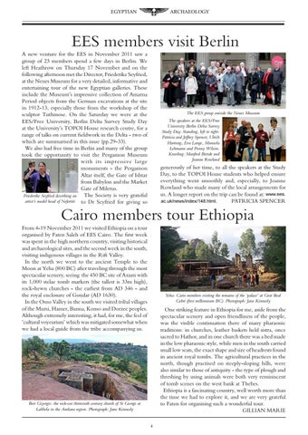EES members visit Berlin A new venture for the EES in November 2011 saw a group of 23 members spend a few days in Berlin. We left Heathrow on Thursday 17 November and on the following afternoon met the Director, Friederike Seyfried, at the Neues Museum for a very detailed, informative and entertaining tour of the new Egyptian galleries. These include the Museum’s impressive collection of Amarna Period objects from the German excavations at the site in 1912-13, especially those from the workshop of the sculptor Tuthmose. On the Saturday we were at the EES/Free University, Berlin Delta Survey Study Day at the University’s TOPOI House research centre, for a range of talks on current fieldwork in the Delta - two of which are summarised in this issue (pp.29-33). We also had free time in Berlin and many of the group took the opportunity to visit the Pergamon Museum with its impressive large monuments - the Pergamon Altar itself, the Gate of Ishtar from Babylon and the Market Gate of Miletus. The Society is very grateful Friederike Seyfried describing an artist’s model head of Nefertiti to Dr Seyfried for giving so