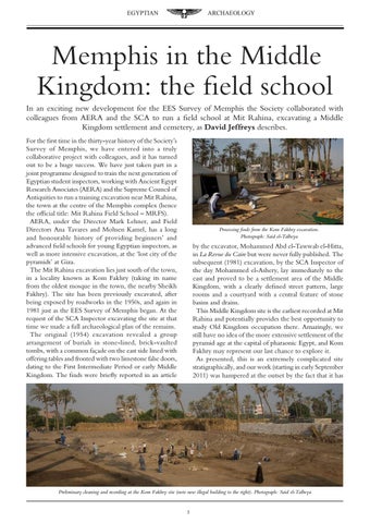 Memphis in the Middle Kingdom: the field school In an exciting new development for the EES Survey of Memphis the Society collaborated with colleagues from AERA and the SCA to run a field school at Mit Rahina, excavating a Middle Kingdom settlement and cemetery, as David Jeffreys describes. For the first time in the thirty-year history of the Society’s Survey of Memphis, we have entered into a truly collaborative project with colleagues, and it has turned out to be a huge success. We have just taken part in a joint programme designed to train the next generation of Egyptian student inspectors, working with Ancient Egypt Research Associates (AERA) and the Supreme Council of Antiquities to run a training excavation near Mit Rahina, the town at the centre of the Memphis complex (hence the official title: Mit Rahina Field School – MRFS). AERA, under the Director Mark Lehner, and Field Directors Ana Tavares and Mohsen Kamel, has a long and honourable history of providing beginners’ and advanced field schools for young Egyptian inspectors, as well as more intensive excavation, at the ‘lost city of the pyramids’ at Giza. The Mit Rahina excavation lies just south of the town, in a locality known as Kom Fakhry (taking its name from the oldest mosque in the town, the nearby Sheikh Fakhry). The site has been previously excavated, after being exposed by roadworks in the 1950s, and again in 1981 just as the EES Survey of Memphis began. At the request of the SCA Inspector excavating the site at that time we made a full archaeological plan of the remains. The original (1954) excavation revealed a group arrangement of burials in stone-lined, brick-vaulted tombs, with a common façade on the east side lined with offering tables and fronted with two limestone false doors, dating to the First Intermediate Period or early Middle Kingdom. The finds were briefly reported in an article