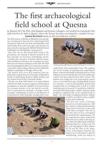 taught by the writer and Geoffrey Tassie. The emphasis was on the necessity of recording each archaeological feature (context) individually, ensuring that all excavated sediment was sieved and that the recovered artefacts and ecofacts were kept separately from other contexts. The students were taught that each archaeological context – be it a cut or the fill of a pit, including burials or parts of a structure – must be photographed, planned and recorded both on recording forms as well as in field notebooks, prior to removal. A crucial factor within the training was that all procedures could be carried out using inexpensive equipment that can be acquired locally in Egypt - the same kinds of equipment that the students would be most likely to have available in their future fieldwork. The first two weeks of training focused on excavation processes, with the students working predominantly within an excavation area to the south of the falcon necropolis. This was an area that had not been investigated previously by the current mission, and the magnetometer survey results from 2006 proved successful in detecting an area of pit and coffin burials within the Ptolemaic-Roman cemetery (see EA 28, p.32; and reports in JEA volumes 93, 94 and 96). Due to the nature of the archaeological material, the students were well trained in physical anthropology, under the tuition of Students at the Quesna field school trowelling back in Trench T9