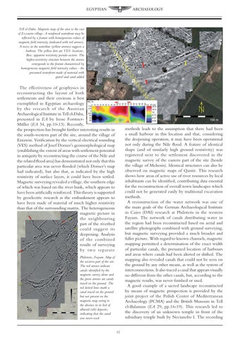 methods leads to the assumption that there had been a small harbour in this location and that, considering the deepening operation, it may have been operational not only during the Nile flood. A feature of identical shape (and of similarly high ground resistivity) was registered next to the settlement discovered in the magnetic survey of the eastern part of the site (beside the village of Mehesin). Identical structures can also be observed on magnetic maps of Qantir. This research shows how areas of active use of river resources by local inhabitants can be identified, contributing data essential for the reconstruction of overall town landscapes which could not be generated easily by traditional excavation methods. A reconstruction of the water network was one of the main goals of the German Archaeological Institute in Cairo (DAI) research at Philoteris in the western Fayum. The network of canals distributing water in the region had been reconstructed based on aerial and satellite photographs combined with ground surveying, but magnetic surveying provided a much broader and fuller picture. With regard to known channels, magnetic mapping permitted a determination of the exact width of particular canals, the presumed location of harbours and areas where canals had been altered or shifted. The mapping also revealed canals that could not be seen on the ground by any other means, as well as the system of interconnections. It also traced a canal that appears visually no different from the other canals, but, according to the magnetic results, was never finished or used. A good example of a sacred landscape reconstructed by means of magnetic prospection is provided by the joint project of the Polish Center of Mediterranean Archaeology (PCMA) and the British Museum in Tell el-Balamun (EA 29, pp.16-19). This research led to the discovery of an unknown temple in front of the subsidiary temple built by Nectanebo I. The recording