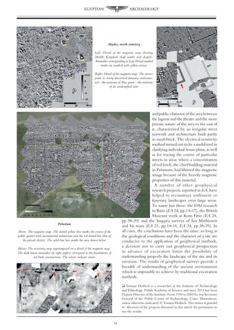 and public character of the area between the lagoon and the theatre and the more private nature of the area to the east of it, characterised by an irregular street network and architecture built partly in mud-brick. The electrical resistivity method turned out to be a useful tool in clarifying individual house plans, as well as for tracing the course of particular streets in areas where a concentration of red brick, the chief building material in Pelusium, had blurred the magnetic image because of the heavily magnetic properties of this material. A number of other geophysical research projects, reported in EA, have helped to reconstruct settlement or funerary landscapes over large areas. To name but three: the DAI research in Buto (EA 24, pp.14-17), the British Museum work at Kom Firin (EA 24, pp.38-39) and the Saqqara surveys of Ian Mathieson and his team (EA 21, pp.14-16, EA 34, pp.38-39). In all cases, the conclusions have been the same: so long as the geological conditions and the character of a site are conducive to the application of geophysical methods, a decision not to carry out geophysical prospection in advance of excavation limits the possibility of understanding properly the landscape of the site and its environs. The results of geophysical surveys provide a breadth of understanding of the ancient environment which is impossible to achieve by traditional excavation methods.