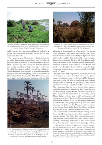 identified as an ancient levée of the river. Five metres down, embedded in the muds of the old river bank, they found carnelian and amethyst, the types of precious stone that were favoured by the jewellers of the ancient capital, Itj-tawi, suggesting that the river still flowed in the early Middle Kingdom. Later pyramid builders focused their attention on Lahun at the entrance to the Fayum and by the New Kingdom there is little evidence for large settlements along the former western branch of the Nile north of Lahun. Perhaps future EES projects will solve the puzzle of what happened to this river but for now the prime suspect in its disappearance is the late Middle Kingdom ruler Amenemhat III, who irrigated the Fayum to form a mighty lake and develop the agriculture of what would ultimately become the bread-basket of the Roman world. We conjecture that his works diverted the western channel (known further south as the Bahr Yusuf) through the Hawara gap into the Fayum and paved the way for New Kingdom development in the area: the Gurob Harem Palace, with its great wealth and international trade relations. Since Memphis still had command of the channel that flanked it to the east, the supply of food and taxes from the developing Fayum may have been a fair exchange for the loss of the Maaty, especially at a time when climate change had reduced the Saharan area from a game-rich, grassy savannah to a howling desert. At Memphis and Karnak the landscape setting of sites has changed both during and since their occupation. The palimpsest of the Nile Valley shows that we must assume that the river is moving unless we have evidence to the contrary. Fortunately, the tools are to hand so that sites all along the Nile can be placed in their landscape context. q Judith Bunbury is a Fellow of St Edmund’s College, Cambridge. She is grateful to her students at the University of Cambridge: Ben Pennington and Laurence Pryer (Earth Sciences Department) and Pedro Goncalves (Archaeology Department) whose research has contributed to this article. She would also like to thank David Jeffreys and Angus Graham for their collaboration and inspiration. Photographs by the writer, unless otherwise indicated.