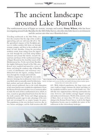 The northernmost areas of Egypt are remote, swampy and watery. Penny Wilson, who has been investigating around Lake Burullus for the EES Delta Survey, describes this little-known environment and the ancient sites that once flourished there. Travelling northwards in the Nile Delta, you have the sensation that the edge of the world is approaching and you will soon fall off it. The flat agricultural expanses of the floodplain give way to endless modern fish farms cut through swampy margins, and then to the reedbeds and shore of Lake Burullus. Using the prevailing northern winds, boats sailing across the lagoon can tack through the reed beds along hidden channels and around flat islands, towards the sand bars and dunes of the northernmost fringe of Egypt. Beyond are the clear blue waters of the Mediterranean Sea. To the east of Lake Burullus the mighty Sebennytic branch of the Nile once flowed, now canalised and tamed by a series of drains, and along the southern edge of Burullus a series of distributaries and waterways once debouched into the lagoon, creating channelways through the swamps and reed beds. Modern irrigation has brought the area under intensive farming, but in pharaonic times it was Map of Burullus and the surrounding areas, showing ancient sites (after the EES Delta most likely only occasionally visited by fishermen, Survey), the lagoon and sea areas (in blue) and modern fish-farms/ancient marshes (green). Contour lines are in metres above sea level bird catchers and reed collectors. As the Delta 641. With reduced populations, the large towns and slowly moved northward, due to the yearly deposition cities could no longer maintain the drains and dykes to of silt, more land became available for exploitation. From the standards needed to survive in this hostile area. The the Roman Period onwards there was an enormous effort tells that once supported these thriving communities do to make the most of these northernmost areas, which, in exist, however, and number amongst Egypt’s unsung turn, created an agricultural land boom from the first to and undiscovered treasures. North of the ancient centre the tenth centuries AD. Towns and villages sprang up, of Buto, there are more than 100 sites, many of them inhabited by people eager to take advantage of the new dating to the Roman Period. Survey work by the Egypt land and encouraged by an empire hungry for grain. Exploration Society aims to establish the nature of the The populations in the area declined, however, due to settlements in this extraordinary landscape. war, famine and plague, and the Arab invasion after AD