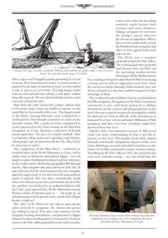 is also a time when the prevailing northerly winds become both stronger and more frequent, helping navigators to overcome the stronger current wherever the two are in opposition. Where they weren’t, particularly around the Dendera bend, navigators had often to beat against both wind and current. The Delta was a tougher proposition than the Nile Valley. The warming land often generated land breezes that cancelled out Freeing a Nile cargo vessel from a sandbank. With the vessel anchored, the captain watches as his crew seek to the prevailing northwesterlies ‘bounce’ the vessel off the bank. Image: F L Norden blowing in off the Mediterranean laden cargo vessel struggled against grounding in several Sea, resulting in frequent calms that left Nile boats facing locations. Near Samannud, he writes, ‘we found ourselves so a strong current with no supporting wind. Even when perplexed by the banks of sand that we knew not what method the sea breezes broke through, Delta channels were not to take in order to get out of them. Two large barques loaded always oriented in a way that enabled navigators to take with sena had unloaded there already a week before, without advantage of them. being able to put off. We were afraid of finding ourselves under The combined result of all these factors was hard labour a necessity of doing the same’. for Nile navigators. Navigation on the Nile is sometimes Data from the early nineteenth century indicate that caricatured as easy, with boats portrayed as drifting a 100-tonne cargo vessel was unable to operate on the downstream on the current, and sailing upstream on the main Nile for five months of the year. The largest vessels wind: this may in part be because the hieroglyphic symbol in the Delta, carrying 60tonnes, were excluded for a for upstream is a boat in full sail, while downstream is similar period. That brought commerce to a halt. In the indicated by a boat with its sail furled. Millennia of Nile eleventh century AD, a trader in Cairo complained in navigators, had they ever been consulted, might have a letter preserved in the Cairo Geniza (at the Ben Ezra dissented from that view. Synagogue in Cairo, housing a collection of Jewish Indeed a delve into historical accounts of Nile travel manuscripts) that, ‘The city is at a complete standstill. There yields a far richer understanding of what it was like to is no buying or selling, and no one is spending a single dirham. journey on the river. The founder of the EES, Amelia All the people’s eyes are turned towards the Nile. May God in Edwards, was herself a sympathetic observer of the crew his mercy raise its waters’. of her dhahabiyya, an oared and sailed vessel that was the The completion of the Nile flood – celebrated in choice of wealthy nineteenth-century western tourists. medieval times at the Roda Nilometer in Cairo, and in Travelling up the Nile valley in 1873, she noted that her earlier times at nilometers throughout Egypt – was not crew were ‘sometimes towing … on a rope all day long, like simply a matter of jubilation for farmers and tax collectors. As the tenth century AD Persian geographer Ibn Hawqal reports: ‘Most navigation takes place with the rise of the Nile’. It was at this time that the main waterways became navigable again for cargo vessels. It was also when the main artificial canals re-opened. This was done systematically. Earth dams were thrown across the canal mouths ahead of the rise, and they were broken in a co-ordinated fashion, with the Cairo canal opened first. As the thirteenth-century Persian scholar al-Qazwini puts it: ‘… the people go out with great pomp to break open the canals, and the land of Egypt becomes a single sea’. The effect of the flood was not only to open up the entire network to navigation: the current also picked up, tripling in speed. That gave extra assistance to the navigator heading downstream, and presented a bigger The Roda Nilometer in Cairo was the arbiter of the opening of the main navigational canals of Egypt, such as those leading from the Nile to obstacle for those heading upriver. Fortunately, the flood Alexandria and Suez. Photograph: J P Cooper season in the Nile valley, particularly in the earlier months, 26