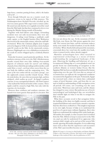 this was not always the case. At the mountain of Gebel Abi Foda, near Asyut, the Nile presses against the river cliff. The current runs faster, and the mountain induces tricky cross winds. For medieval authors, it was the abode of witches. When Amelia Edwards passed the mountain, crosswinds drove her vessel into the muddy river bank, where it joined twelve others already trapped. Maritime archaeologists have often resorted to experimental archaeology as a means of better understanding the navigational landscapes of the past. Observing the handling and behaviour of, say, a reconstructed Viking ship or a sewn-planked vessel can greatly boost our understanding of navigation in the northern Atlantic or western Indian Ocean. But the Egyptian Nile has been so radically transformed by human engineering over the past 150 years that no amount of reconstruction can replicate the navigational conditions encountered by Egyptians in the past. Fortunately, Egypt has exercised such a draw on visitors that a substantial corpus of travel literature exists, and from this we can start to build an understanding of Nile navigation across all periods. Of course, not everything was the same across time. Waterways came and went, and the climate has changed to some extent. But judicious use of travel, meteorological and hydrological data can nevertheless shed valuable light on what it was like to navigate the Nile in the past. What these accounts reveal is that navigation before the building of the dams was highly seasonal, and that it required hard labour and a much more extensive expertise than has often been credited to it. This insight is important in its own right, because it helps us to understand the past lives of a great many ordinary Egyptians. But it also helps us to understand the making of the wider landscape. Alexandria, for example, is a fine sea-port, but it is isolated from the Nile. Efforts to keep it connected it to the Nile via canal can only be understood if we appreciate why mariners didn’t simply sail in and out of the nearest Nile mouth, ignoring Alexandria altogether. It is in addressing issues such as these that the experiences and encounters of the Nile’s past travellers become so very valuable. q John P Cooper is a Lecturer in Arab Studies and Islamic Material Culture at the University of Exeter. His book on the navigational landscape of the medieval Nile is due for publication in 2013.
