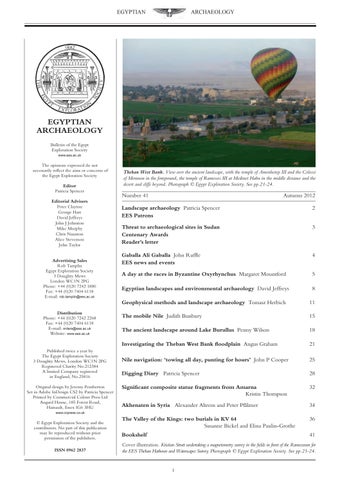 The opinions expressed do not necessarily reflect the aims or concerns of the Egypt Exploration Society Editor Patricia Spencer Editorial Advisers Peter Clayton George Hart David Jeffreys John J Johnston Mike Murphy Chris Naunton Alice Stevenson John Taylor Advertising Sales Rob Tamplin Egypt Exploration Society 3 Doughty Mews London WC1N 2PG Phone: +44 (0)20 7242 1880 Fax: +44 (0)20 7404 6118 E-mail: rob.tamplin@ees.ac.uk Distribution Phone: +44 (0)20 7242 2268 Fax: +44 (0)20 7404 6118 E-mail: orders@ees.ac.uk Website: www.ees.ac.uk