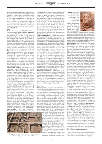 Upper Egypt Qarara: After two years’ interruption, the Univ of Tübingen team, led by Béatrice Huber, investigated an area in the S of the Coptic site, far away from the main settlement. Some walls were revealed by excavation but it was not possible to define their exact function. No domestic installation has been discovered. The settlement had been abandoned and the constructions later collapsed. The area was then used as a cemetery by the Coptic population, so that the tombs lie here over the settlement and not beneath it, as is the case in other parts of the site. Archaeological material and textiles date the cemetery from the mid fourth to the fifth centuries. Both the settlement and cemetery were seriously looted in 2011 and the team had to clear and record a 20m by 20m area in the N part of the settlement after it had been dug down to the bedrock by sebbakhin. The stratigraphy and the inner structures of the houses, built directly over the Coptic cemetery, are inevitably disturbed but several periods of occupation can be observed. http://tinyurl.com/7vgdcuh Sharuna (Kom el-Ahmar): The Univ of Tübingen team, led by Béatrice Huber, continued the work begun in 2010 in the NW side of the rock necropolis (directed by Luis Gonzálves), completing research in the OK tomb M8b, where the inner chamber was excavated. Around M8b three completely robbed OK tombs Heliopolis: The excavation of the temple sanctuary in Suq elwith shafts and funerary chambers were Khamis. Photograph courtesy of Dietrich Raue 31