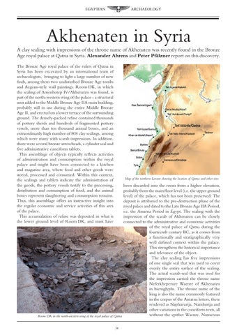 Akhenaten in Syria A clay sealing with impressions of the throne name of Akhenaten was recently found in the Bronze Age royal palace at Qatna in Syria. Alexander Ahrens and Peter Pfälzner report on this discovery. The Bronze Age royal palace of the rulers of Qatna in Syria has been excavated by an international team of archaeologists, bringing to light a large number of new finds, among them two undisturbed Bronze Age tombs and Aegean-style wall paintings. Room DK, in which the sealing of Amenhotep IV/Akhenaten was found, is part of the north-western wing of the palace - a structural unit added to the Middle Bronze Age IIA main building, probably still in use during the entire Middle Bronze Age II, and erected on a lower terrace of the surrounding ground. The densely-packed refuse contained thousands of pottery sherds and hundreds of fragmented pottery vessels, more than ten thousand animal bones, and an extraordinarily high number of 808 clay sealings, among which were many with scarab impressions. In addition, there were several bronze arrowheads, a cylinder seal and five administrative cuneiform tablets. This assemblage of objects typically reflects activities of administration and consumption within the royal palace and might have been connected to a kitchen and magazine area, where food and other goods were stored, processed and consumed. Within this context, the sealings and tablets indicate the administration of the goods, the pottery vessels testify to the processing, distribution and consumption of food, and the animal bones represent slaughtering and consumption remains. Thus, this assemblage offers an instructive insight into the regular economic and service activities of this area of the palace. This accumulation of refuse was deposited in what is the lower ground level of Room DK, and must have