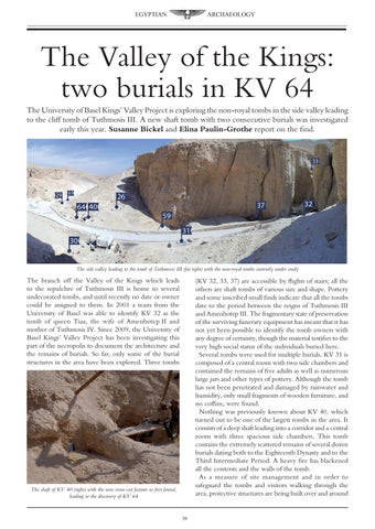 The Valley of the Kings: two burials in KV 64 The University of Basel Kings’ Valley Project is exploring the non-royal tombs in the side valley leading to the cliff tomb of Tuthmosis III. A new shaft tomb with two consecutive burials was investigated early this year. Susanne Bickel and Elina Paulin-Grothe report on the find.