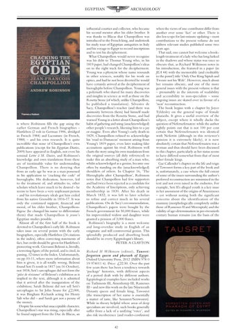 influential courtier and collector, who became his second mentor after his elder brother. It was thanks to Blacas that Champollion was introduced to the French king, and undertook his study tour of Egyptian antiquities in Italy and his voyage to Egypt to record inscriptions and to test his decipherment. What Champollion would never recognise was his debt to Thomas Young who, in his 1819 paper, had changed Champollion’s ideas on to the right track for the decipherment. Young was a physicist whose name resounds in other sciences, notably for his work on optics, and had he not been diverted he would have certainly arrived at the decipherment of hieroglyphs before Champollion. Young was a polymath who shared his many discoveries and insights in science as well as those on the Rosetta Stone (of which, unlike Champollion, he published a translation). Silvestre de Sacy, Champollion’s teacher (and there was animosity between them) had himself made discoveries from the Rosetta Stone, and had warned Young in a letter about Champollion’s habit of gathering and using (unacknowledged) other people’s research, likening him to a jay or magpie. Even after Young’s early death in 1829, Champollion refused to acknowledge his ‘road to Damascus’ moment arising from Young’s 1819 paper, even later making false accusations against his rival. Robinson well charts the story using his own translations from the original sources (all duly referenced) to make this an absorbing study of a man who, whilst acknowledged as a genius, became one often by standing on the (unacknowledged) shoulders of others. In Chapter 16, ‘The Hieroglyphs after Champollion’, Robinson notes that Champollion had few supporters and had twice been rejected as a candidate for the Academy of Inscriptions, only achieving membership in 1830. After his death in March 1832, it was left to later scholars to refine and correct much in his several publications. On de Sacy’s recommendation, Champollion’s papers were bought by the French government for 50,000 francs, while his impoverished widow and daughter were granted a pension of 3,000 francs. Robinson’s biography is a most welcome and long-overdue study in English of an enigmatic and still controversial genius. This splendidly produced and absorbing book should be in every Egyptologist’s library. PETER A CLAYTON Richard H Wilkinson (editor), Tausret: forgotten queen and pharaoh of Egypt. Oxford University Press, 2012 (ISBN 978 0 19 974011 6). Price: £22.50. Over the past few years there has been a tendency towards ‘package’ histories, with different aspects of a period dealt with by different authors. Egyptological examples have included works on Tuthmosis III, Amenhotep III, Ramesses III – and now this work on the late Nineteenth Dynasty queen and female king, Tawosret (the transcription of her name is essentially a matter of taste, like Senusret/Senwosret). While in theory helpful where areas of deep specialism are involved, such books generally suffer from a lack of a unifying ‘voice’, and also risk incoherence (and reader-confusion) 42
