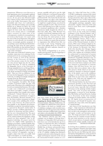 present, tastefully told and in just the right depth to delineate a real human being and to suggest how his personal life conditioned his professional life. One learns that his first and longest marriage was often a trial, depriving him of the solace and additional creative space he might have sought at home, away from his ambitious agenda at work. That was because Frances Hart Breasted never fully recovered her emotional equilibrium after a drunken obstetrician fatally bungled the delivery of their first child. Also, while Breasted was certainly a loyal friend, inspiring teacher, and able administrator, it becomes clear that he was not always the easiest person to work with. Breasted’s stature was such that there has been a tendency to assume that any person or organisation that differed from him was necessarily in the wrong. Stripping away some of the gilding allows an even brighter personality and more authentic character to shine through. The history of Egyptology is an active, rapidly growing field. American Egyptologist is a major contribution to it. JASON THOMPSON