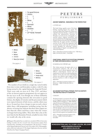 An Ancient egyptiAn literAry text in context: thE instruction of PtahhotEP F. HAgEN The book attempts to reconstruct the social context for Egyptian wisdom literature during the Middle and New Kingdoms (c. 2000-1000 BC), using The Instruction of Ptahhotep as a case-study. By looking at the archaeology and material culture of manuscripts, intertextual references and editorial changes to the text over time, the book traces the life of a wisdom poem from the hands of its copyists to the minds of its readers, charting its use and reception over hundreds of years. 2012 – Orientalia Lovaniensia Analecta 218 – X-313 p. – ISBN 978-90-429-2600-4 – 84 EURO