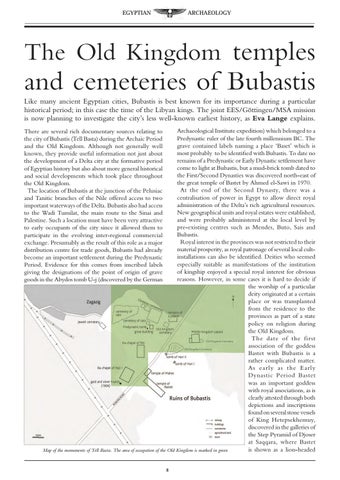 and cemeteries of Bubastis Like many ancient Egyptian cities, Bubastis is best known for its importance during a particular historical period; in this case the time of the Libyan kings. The joint EES/Göttingen/MSA mission is now planning to investigate the city’s less well-known earliest history, as Eva Lange explains. Archaeological Institute expedition) which belonged to a Predynastic ruler of the late fourth millennium BC. The grave contained labels naming a place ‘Baset’ which is most probably to be identified with Bubastis. To date no remains of a Predynastic or Early Dynastic settlement have come to light at Bubastis, but a mud-brick tomb dated to the First/Second Dynasties was discovered north-east of the great temple of Bastet by Ahmed el-Sawi in 1970. At the end of the Second Dynasty, there was a centralisation of power in Egypt to allow direct royal administration of the Delta’s rich agricultural resources. New geographical units and royal estates were established, and were probably administered at the local level by pre-existing centres such as Mendes, Buto, Sais and Bubastis. Royal interest in the provinces was not restricted to their material prosperity, as royal patronage of several local cultinstallations can also be identified. Deities who seemed especially suitable as manifestations of the institution of kingship enjoyed a special royal interest for obvious reasons. However, in some cases it is hard to decide if the worship of a particular deity originated at a certain place or was transplanted from the residence to the provinces as part of a state policy on religion during the Old Kingdom. The date of the first association of the goddess Bastet with Bubastis is a rather complicated matter. As early as the Early Dynastic Period Bastet was an important goddess with royal associations, as is clearly attested through both depictions and inscriptions found on several stone vessels of King Hetepsekhemuy, discovered in the galleries of the Step Pyramid of Djoser at Saqqara, where Bastet is shown as a lion-headed Map of the monuments of Tell Basta. The area of occupation of the Old Kingdom is marked in green