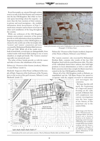 Royal ka-temples are attested through written sources as early as the First Dynasty and continued into the late Old Kingdom. But while we have only sparse knowledge about the majority - no more than the bare mention of their existence in private and royal inscriptions - the available information about ka-enclosures of Pepi I is much more extensive and we know of at least six other such installations of the king throughout the country. While any settlement of the Old Kingdom remains unexcavated, cemeteries of the period provide us with information about its population. Important burial places of the Old Kingdom are situated to the north-east of the ka-temples (the ‘western’ and ‘eastern’ cemeteries) and were Detail of the decoration of the tomb of Ankhembaset in the eastern cemetery at Bubastis. excavated by Mohammed Ibrahim Bakr between Photograph: © Tell Basta Project 1978 and 1988. While all of the tombs were built of mud-brick, several types are distinguishable, from Nebsen (b): ‘Overseer of the Granite (workers), Inspector vaulted tombs with burial shafts leading to one or more of the Priests of Bastet, Nebsen(’s son) Nebsen’. chambers, to simple pit burials. The ‘western cemetery’ The ‘eastern cemetery’, also excavated by Mohammed especially was intensively used. Ibrahim Bakr, contains elite tombs of the late Old The stelae of three burials provide us with the names Kingdom, lined with decorated limestone slabs. The titles and titles of some elite inhabitants of the town: of the individuals buried there indicate that held high Nebsen (a): ‘Overseer of the Granite (workers), Nibastet positions in local administration as well as court titles. (’s son) Nebsen’ (tomb 1). Both cemeteries show that a temple for Bastet must have Meshetsh: ‘Inspector of the Priests’ (of Bastet/of the temexisted in the late Old Kingdom at Bubastis. ple of Pepi), ‘Inspector of the Seal-bearers of the Treasury, Almost all of the Old Kingdom tombs at Bubastis are privy to the secrets of the god’s treasure, Nibastet (’s son) unpublished and the Tell Basta Project has started to Meshetsh’ (tomb 17). co-operate with the original excavator to redocument and investigate the cemeteries. We hope that this will mark the beginning of a large-scale project focusing on the early periods of Bubastis that will complement our current investigations into the later stages of the history of this important city in the eastern Delta.