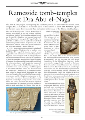 Ramesside tomb-temples at Dra Abu el-Naga The DAI Cairo project investigating the southern part of the extraordinary double tomb complex K93.11/K93.12 had its seventh season in the autumn of 2012. Ute Rummel reports on the most recent discoveries and their implication for the study of the Theban ritual landscape. The aim of the long-term German Archaeological Institute (DAI) project at Dra Abu el-Naga, exploring especially the tombs of the Second Intermediate Period and the early New Kingdom, is to trace and understand the development of a necropolis (EA 7, pp.6-8, EA 10, pp.34-35). In addition to the in-depth study of individual tombs more general questions are pursued such as the interrelations between tombs, their spatial distribution and their context within a defined landscape. In 1993 a large double tomb complex was included in the investigation. Work started in its northern part, K93.11 (see EA 14, pp.4-6), since the interior’s layout suggested the rock architecture was cut in the early New Kingdom. Archaeological work of subsequent years revealed that this tomb had been reused by the High Priest of Amun, Ramsesnakht, who held office during the reigns of Ramesses IV to Ramesses IX. Ramsesnakht remodelled the earlier tomb into a tomb-temple, the remains of which were discovered in the fill of the forecourts. He created two open courts by adding a mud-brick pylon at the eastern end of the terrace and the inner court was turned into a peristyle with 26 sandstone columns some topped by Hathor capitals. This capital type is an element of temple architecture which had not previously been attested in a New Kingdom tomb context. In the course of the excavations, thousands of sandstone relief fragments came to light, mostly from the inner court’s former wall casing. They show that the main subject of the decoration was the communication of the High Priest with the gods, particularly the Theban Triad and the