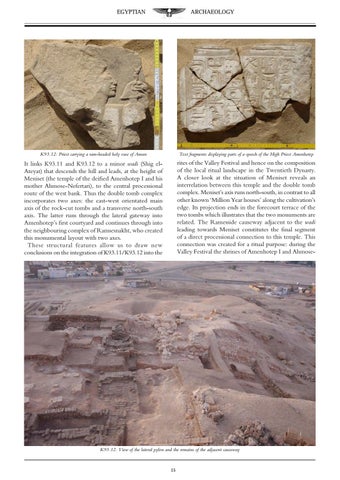 It links K93.11 and K93.12 to a minor wadi (Shig elAteyat) that descends the hill and leads, at the height of Meniset (the temple of the deified Amenhotep I and his mother Ahmose-Nefertari), to the central processional route of the west bank. Thus the double tomb complex incorporates two axes: the east-west orientated main axis of the rock-cut tombs and a transverse north-south axis. The latter runs through the lateral gateway into Amenhotep’s first courtyard and continues through into the neighbouring complex of Ramsesnakht, who created this monumental layout with two axes. These structural features allow us to draw new conclusions on the integration of K93.11/K93.12 into the