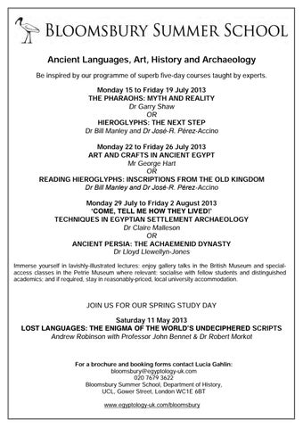 academics; and if required, stay in US reasonably-priced, local university accommodation. Immerse yourself in lavishly-illustrated lectures; enjoy gallery talks in the British Museum and specialJOIN FOR OUR SPRING STUDY DAY 11 May 2013with fellow students and distinguished access classes in the Petrie Museum Saturday where relevant; socialise academics; and if required, stay in US reasonably-priced, local university accommodation. JOIN FOR OUR SPRING STUDY DAY LOST LANGUAGES: THE ENIGMA OF THE WORLD’S UNDECIPHERED SCRIPTS