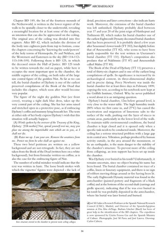 detail, precision and later corrections - also indicate hasty work. Moreover, the extension of the burial chamber was left unfinished. Djehuty probably died between year 17 and year 20 of the joint reign of Hatshepsut and Tuthmosis III, which makes his burial chamber one of the earliest Eighteenth Dynasty decorated burial chambers that has been preserved. It is probably dated a few years after Senenmut’s lower tomb (TT 353), but slightly before that of Amenemhat (TT 82), who seems to have been partly responsible for the text written in Useramun’s burial chamber (TT 131). Djehuty’s composition also predates that of Nakhtmin (TT 87) and Amenemhab called Mahu (TT 85). The Book of the Dead of Djehuty (TT 11) preserves a total of thirty-six chapters and is one of the earliest long compilations of spells. Its significance is increased by its archaeological context, its three-dimensional display and its precise dating. Percy Newberry was inside the burial chamber for at least three days in February 1899, copying the text, according to his notebook now kept at the Griffith Institute, Oxford. Why he never published a word about it is an intriguing question. Djehuty’s burial chamber, 12m below ground level, is very close to the water table. The high humidity inside (80% when we first came in, and 27ºC) has caused the reactivation and migration of limestone salts to the surface of the walls, pushing out the layer of stucco in certain areas, particularly in the lower level of the walls. To maintain stable environmental conditions, the burial chamber is kept closed and it is opened only when a specific task needs to be conducted inside. Moreover, the ceiling has a serious structural problem with a large gap in its central area. Vibration, perhaps produced by human activity outside, in the area around the monument, or by an earthquake, is the main danger to the stability of the chamber’s structure. To prevent more of the ceiling from collapsing, an iron support has been set up inside the chamber. Was Djehuty ever buried in his tomb? Unfortunately, it remains uncertain, since no object bearing his name has been found. The burial chamber contained no trace of a coffin, linen or funerary equipment, and there is no sign of robbers moving things around or fire having been lit. The early Eighteenth Dynasty material was found in the antechamber (painted pottery and fragments of a black coffin) and at the bottom of the second shaft (earrings and girdle spacers), indicating that if he was ever buried in his tomb he was probably deposited in the antechamber, where his burial was later looted and burned. q José M Galán is Research Professor at the Spanish National Research Council (CSIC), Madrid, and Director of the Spanish-Egyptian mission at Dra Abu el-Naga. Barbara Lüscher (Basel) has been of great help in the identification of the BD chapters. The expedition is now sponsored by Unión Fenosa Gas and the Spanish Ministry of Culture. Photographs: José M Parra and José Latova. Drawing: Carlos Cabrera.
