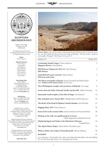 The opinions expressed do not necessarily reflect the aims or concerns of the Egypt Exploration Society Editor Patricia Spencer Editorial Advisers Peter Clayton George Hart David Jeffreys John J Johnston Mike Murphy Chris Naunton Alice Stevenson John Taylor Advertising Sales Rob Tamplin Egypt Exploration Society 3 Doughty Mews London WC1N 2PG Phone: +44 (0)20 7242 1880 Fax: +44 (0)20 7404 6118 E-mail: rob.tamplin@ees.ac.uk Distribution Phone: +44 (0)20 7242 2268 Fax: +44 (0)20 7404 6118 E-mail: orders@ees.ac.uk Website: www.ees-shop.co.uk