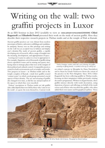 Writing on the wall: two graffiti projects in Luxor At an EES Seminar in June 2012 (available to view at: www.ustream.tv/recorded/23505099) Chloé Ragazzoli and Elizabeth Frood presented their work on the study of ancient graffiti. Here they describe their respective research projects in Theban tombs and at the temple of Ptah at Karnak. Ancient graffiti practices are very distant from modern stereotypes of furtive, subversive scribblings and vandalism. In antiquity, literacy was an elite privilege and writing on the wall was an accepted way to fashion and display one’s identity.The study of ancient graffiti, a rapidly developing area of research, offers a range of insights into the meaning, development, and appropriation of space. Leaving one’s name in a place is a way to appropriate it. For example, Egyptians carved thousands of graffiti along desert expedition routes and in mining and quarry sites, laying claim to strategic places that were at the margins of their political and cultural control. Comparable practices existed in built environments such as temples and tombs. Two projects in Luxor - in Theban tombs and in the temple complex of Karnak - study how graffiti created ‘contact zones’ in which social groups presented crucial aspects of their identity. The use and meaning of graffiti also changed over time, as did the use and perception of the spaces in which they were inscribed. Visitors’ inscriptions in Theban tombs are ink graffiti (also called dipinti) that were left by those who ‘came to see the tomb’, to quote the texts themselves. Current work