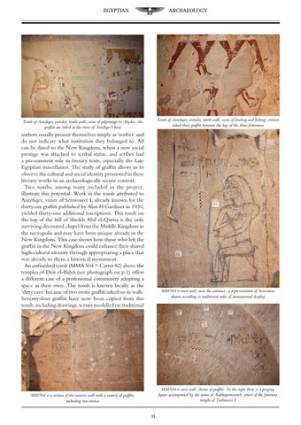 authors usually present themselves simply as ‘scribes’ and do not indicate what institution they belonged to. All can be dated to the New Kingdom, when a new social prestige was attached to scribal status, and scribes had a pre-eminent role in literary texts, especially the Late Egyptian miscellanies. The study of graffiti allows us to observe the cultural and social identity promoted in these literary works in an archaeologically secure context. Two tombs, among many included in the project, illustrate this potential. Work in the tomb attributed to Antefiqer, vizier of Senwosret I, already known for the thirty-six graffiti published by Alan H Gardiner in 1920, yielded thirty-one additional inscriptions. This tomb on the top of the hill of Sheikh Abd el-Qurna is the only surviving decorated chapel from the Middle Kingdom in the necropolis and may have been unique already in the New Kingdom. This case shows how those who left the graffiti in the New Kingdom could enhance their shared high-cultural identity through appropriating a place that was already to them a historical monument. An unfinished tomb (MMA 504 = Carter 82) above the temples of Deir el-Bahri (see photograph on p.1) offers a different case of a professional community adopting a space as their own. The tomb is known locally as the ‘dirty cave’ because of two erotic graffiti inked on its walls. Seventy-four graffiti have now been copied from this tomb, including drawings, scenes modelled on traditional