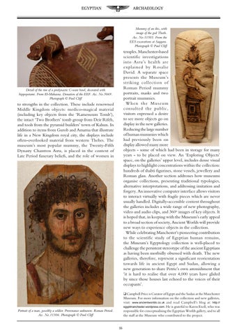 q Campbell Price is Curator of Egypt and the Sudan at the Manchester Museum. For more information on the collection and new galleries, visit: www.ancientworlds.co.uk and read Campbell’s blog at: http:// egyptmanchester.wordpress.com. He is grateful to Karen Exell, who was responsible for conceptualising the Egyptian Worlds gallery, and to all the staff at the Museum who contributed to the project.