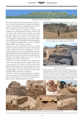 2009. General view of the south excavation area with the limestone and mud-brick storage structures q Maria Helena Trindade Lopes is Director of the Portuguese Mission at the Apries Palace in Kom Tuman, and Professor of Egyptology at the Faculty of Social Sciences and Humanities (FCSH), Universidade Nova de Lisboa. The author is indebted to the SCA for their authorisation and support of the work. This project is supported by the Fundação para a Ciência e a Tecnologia. Photographs and images: Apries Project, Portuguese Mission in Kom Tuman, Memphis.