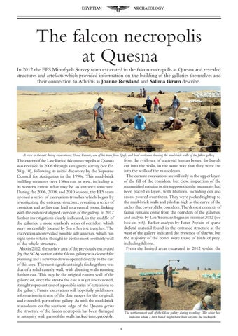 The falcon necropolis at Quesna In 2012 the EES Minufiyeh Survey team excavated in the falcon necropolis at Quesna and revealed structures and artefacts which provided information on the building of the galleries themselves and their connection to Athribis as Joanne Rowland and Salima Ikram describe.