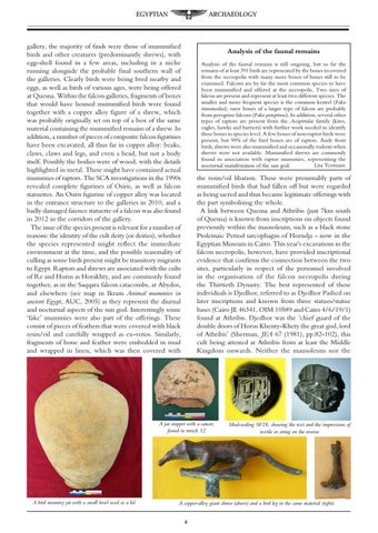 gallery, the majority of finds were those of mummified birds and other creatures (predominantly shrews), with egg-shell found in a few areas, including in a niche running alongside the probable final southern wall of the galleries. Clearly birds were being bred nearby and eggs, as well as birds of various ages, were being offered at Quesna. Within the falcon galleries, fragments of boxes that would have housed mummified birds were found together with a copper alloy figure of a shrew, which was probably originally set on top of a box of the same material containing the mummified remains of a shrew. In addition, a number of pieces of composite falcon figurines have been excavated, all thus far in copper alloy: beaks, claws, claws and legs, and even a head, but not a body itself. Possibly the bodies were of wood, with the details highlighted in metal. These might have contained actual mummies of raptors. The SCA investigations in the 1990s revealed complete figurines of Osiris, as well as falcon statuettes. An Osiris figurine of copper alloy was located in the entrance structure to the galleries in 2010, and a badly damaged faience statuette of a falcon was also found in 2012 in the corridors of the gallery. The issue of the species present is relevant for a number of reasons: the identity of the cult deity (or deities), whether the species represented might reflect the immediate environment at the time, and the possible seasonality of culling as some birds present might be transitory migrants to Egypt. Raptors and shrews are associated with the cults of Re and Horus as Horakhty, and are commonly found together, as in the Saqqara falcon catacombs, at Abydos, and elsewhere (see map in Ikram Animal mummies in ancient Egypt, AUC, 2005) as they represent the diurnal and nocturnal aspects of the sun god. Interestingly some ‘fake’ mummies were also part of the offerings. These consist of pieces of feathers that were covered with black resin/oil and carefully wrapped as ex-votos. Similarly, fragments of bone and feather were embedded in mud and wrapped in linen, which was then covered with