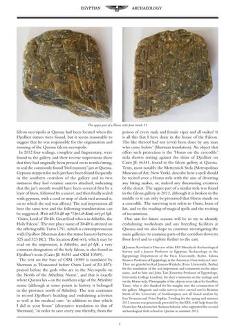 poison of every male and female viper and all snakes! It is all this that I have done in the house of the Falcon. The like thereof had not (ever) been done by any man who came before’ (Sherman translation). An object that offers such protection is the ‘Horus on the crocodile’ stela shown resting against the shins of Djedhor on Cairo JE 46341, found in the falcon gallery at Quesna. Texts, most notably the Metternich Stela (Metropolitan Museum of Art, New York), describe how a spell should be recited over a Horus stela with the aim of deterring any biting snakes, or, indeed any threatening creatures of the desert. The upper part of a similar stela was found in the falcon gallery in 2012, although it is broken in the middle so it can only be presumed that Horus stands on a crocodile. The surviving text refers to Osiris, born of Isis, and to the reading of magical spells and the reciting of incantations. One aim for future seasons will be to try to identify embalming workshops and any breeding facilities at Quesna and we also hope to continue investigating the main galleries: to examine parts of the corridors down to floor level and to explore further to the east.