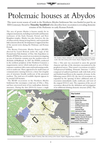 Ptolemaic houses at Abydos The most recent season of work in the Northern Abydos Settlement Site was funded in part by an EES Centenary Award to Timothy Sandiford who describes how excavation is revealing domestic remains of the Ptolemaic to early Roman Periods. The area of greater Abydos is known mainly for its religious monuments, including royal tombs and funerary enclosures of the Early Dynastic Period, and New Kingdom temples. Abydos was also, however, the site of urban activity during its long history, and in particular little is known about the development or supposed decline of the ancient town during the Ptolemaic and Roman Periods The Brown University Abydos Project (BUAP), directed by Laurel Bestock under the aegis of the Pennsylvania-Yale-Institute of Fine Arts Expedition to Abydos (PYIFA), has carried out excavations investigating an area of domestic remains near the modern town of Al-Araba al-Madfunah. In 2007 the PYIFA conducted in the northern periphery of the Northern Cemetery a magnetometry survey which indicated an area of dense responses consistent with a main axial road running northwest to south-east. There appeared to be small routes of communication running between a dense but irregular area of structures broadly north-east of the presumed roadway. The total area of available deposits appears to be around 0.85 hectares. The BUAP excavations in the Northern Abydos Settlement Site encompass a total area of 20m x 20m, and have uncovered most of two multi-phase domestic structures. During the first (2010-11) season a single