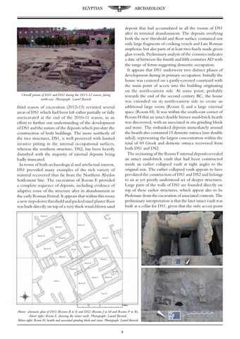 deposit that had accumulated in all the rooms of DS1 after its terminal abandonment. The deposits overlying both the new threshold and floor surface contained not only large fragments of cooking vessels and Late Roman amphorae but also parts of at least two finely made green glass vessels. Preliminary analysis of the ceramics indicates a date of between the fourth and fifth centuries AD with the range of forms suggesting domestic occupation. It appears that DS1 underwent two distinct phases of development during its primary occupation. Initially the house was centered on a partly-covered courtyard with the main point of access into the building originating on the north-eastern side. At some point, probably towards the end of the second century BC, the house was extended on its north-eastern side to create an additional large room (Room I) and a large external space (Room H). It was within the south-east corner of Room H that an intact double burner mud-brick hearth was discovered, with an associated in situ grinding block and stone. The embanked deposits immediately around the hearth also contained 15 demotic ostraca (one double sided), representing the largest concentration within the total of 69 Greek and demotic ostraca recovered from both DS1 and DS2. The sectioning of the Room F internal deposits revealed an intact mud-brick vault that had been constructed inside an earlier collapsed vault at right angles to the original axis. The earlier collapsed vault appears to have pre-dated the construction of DS1 and DS2 and belongs to an as yet poorly understood set of deeper structures. Large parts of the walls of DS1 are founded directly on top of these earlier structures, which appear also to be Ptolemaic from the excavation of associated contexts. The preliminary interpretation is that the later intact vault was built as a cellar for DS1, given that the only access point