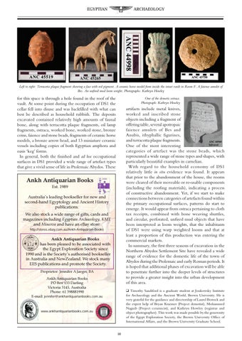 artifacts include metal knives, worked and inscribed stone objects including a fragment of offering table, several apotropaic faience amulets of Bes and Anubis, ithyphallic figurines, and terracotta plaque fragments. One of the most interesting categories of artefact was the stone beads, which represented a wide range of stone types and shapes, with particularly beautiful examples in carnelian. With regard to the household economy of DS1 relatively little in situ evidence was found. It appears that prior to the abandonment of the house, the rooms were cleared of their moveable or re-usable components (including the roofing materials), indicating a process of constructive abandonment. Yet, if we start to make connections between categories of artefacts found within the primary occupational surfaces, patterns do start to emerge. It would appear from ostraca pertaining to cloth tax receipts, combined with bone weaving shuttles, and circular, perforated, unfired mud objects that have been interpreted as loom weights, that the inhabitants of DS1 were using warp weighted looms and that at least a proportion of this production was entering the commercial markets. In summary, the first three seasons of excavation in the Northern Abydos Settlement Site have revealed a wide range of evidence for the domestic life of the town of Abydos during the Ptolemaic and early Roman periods. It is hoped that additional phases of excavation will be able to penetrate further into the deeper levels of structures to provide a greater insight into the urban development of this area.