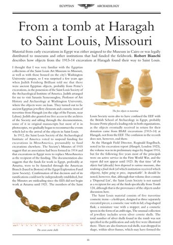 From a tomb at Haragah to Saint Louis, Missouri Material from early excavations in Egypt was either assigned to the Museum in Cairo or was legally distributed to museums and other institutions that had funded the fieldwork. Robert Bianchi describes how objects from the 1913-14 excavation at Haragah found their way to Saint Louis. I thought that I was very familiar with the Egyptian collections of the Saint Louis Art Museum in Missouri, as well as with those housed on the city’s Washington University campus, so I was surprised a few years ago when Judith Feinberg Brilliant told me that there were ancient Egyptian objects, probably from Petrie’s excavations, in the possession of the Saint Louis Society of the Archaeological Institute of America. Judith arranged for me to visit Sarantis Symeonoglou, Professor of Art History and Archaeology at Washington University, where the objects were on loan. They turned out to be ancient Egyptian jewellery elements and cosmetic items of travertine from Haragah (on the edge of the Fayum, near Lahun). Judith also granted me free access to the archives of the Society and sifting through the documentation, some of it in original manuscripts but most of it in photocopies, we gradually began to reconstruct the events which led to the arrival of the objects in Saint Louis. In 1912, the Saint Louis Society of the Archaeological Institute of America voted to suspend funding for excavations in MesoAmerica, presumably to fund excavations elsewhere. The Society’s Minutes of 1915 suggest that an association had been formed in 1914 and that excavations in Egypt were to replace MesoAmerica as the recipient of the funding. The documentation also suggests that the funds for work in Egypt, preferably at Amarna, were to be funneled through the American Branch (based in Boston) of the Egypt Exploration Fund (now Society). Confirmation of that decision and of its ramifications could not be independently established, but the Minutes are misleading since the EES did not begin work at Amarna until 1921. The members of the Saint