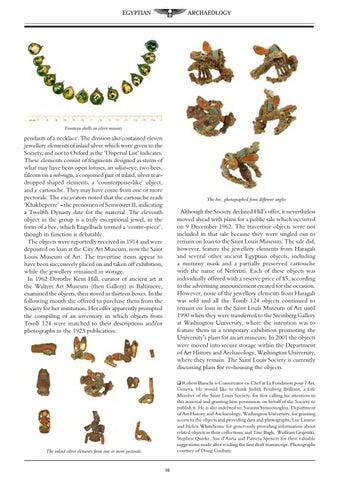 Although the Society declined Hill’s offer, it nevertheless moved ahead with plans for a public sale which occurred on 9 December 1962. The travertine objects were not included in that sale because they were singled out to remain on loan to the Saint Louis Museum. The sale did, however, feature the jewellery elements from Haragah and several other ancient Egyptian objects, including a mummy mask and a partially preserved cartouche with the name of Nefertiti. Each of these objects was individually offered with a reserve price of $5, according to the advertising announcement created for the occasion. However, none of the jewellery elements from Haragah was sold and all the Tomb 124 objects continued to remain on loan in the Saint Louis Museum of Art until 1990 when they were transferred to the Steinberg Gallery at Washington University, where the intention was to feature them in a temporary exhibition promoting the University’s plans for an art museum. In 2001 the objects were moved into secure storage within the Department of Art History and Archaeology, Washington University, where they remain. The Saint Louis Society is currently discussing plans for re-housing the objects. q Robert Bianchi is Conservator en Chef at La Fondation pour l’Art, Geneva. He would like to thank Judith Feinberg Brilliant, a Life Member of the Saint Louis Society, for first calling his attention to this material and granting him permission on behalf of the Society to publish it. He is also indebted to; Sarantis Symeonoglou, Department of Art History and Archaeology, Washington University, for granting access to the objects and providing data and photographs; Luc Limme and Helen Whitehouse for generously providing information about related objects in their collections; and Tine Bagh, Wolfram Grajetzki, Stephen Quirke, Sue d’Auria and Patricia Spencer for their valuable suggestions made after reading the first draft manuscript. Photographs courtsey of Doug Gaubatz.
