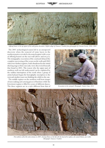 The 2001 archaeological season led to an unexpected discovery when the removal of some layers in the northern portico revealed a decorated register with a row of offering bearers on the rear wall (above and on p.1). The stratigraphic excavation of the courtyard delayed the complete uncovering of the scenes on the wall until 2003 when two further registers, both abandoned in the initial drawing stage at their east ends, were discovered beneath that found in 2001. The reason why the upper part of northern wall was left undecorated can be explained by the sudden interruption of the work when a group of artists had just begun the hieroglyphic inscription to the west and another team was finishing the reliefs to the east. The middle register on the northern wall bears images of men making and carrying pieces of furniture while the lowermost register is filled by scenes of different dances. The three registers are in a style different from that of