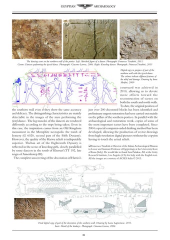 The dancing scene on the northern wall of the portico. Left: Sketched figure of a dancer. Photograph: Francesco Tiradritti, 2011. Centre: Dancers performing the tjeref-dance. Photograph: Giacomo Lovera, 2006. Right: Kneeling dancer. Photograph: FrancescoTiradritti, 2011 Digital copy in progress of part of the northern wall with the tjeref-dance. The colours indicate different features of the relief and damage. Drawing by Irene Morfini, 2009