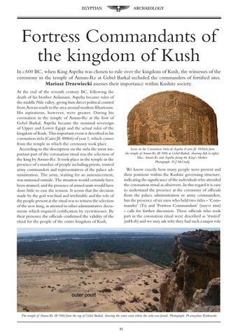 Fortress Commandants of the kingdom of Kush In c.600 BC, when King Aspelta was chosen to rule over the kingdom of Kush, the witnesses of the ceremony in the temple of Amun-Re at Gebel Barkal included the commanders of fortified sites. Mariusz Drzewiecki assesses their importance within Kushite society. At the end of the seventh century BC, following the death of his brother Anlamani, Aspelta became ruler of the middle Nile valley, giving him direct political control from Aswan south to the area around modern Khartoum. His aspirations, however, were greater. During his coronation in the temple of Amun-Re at the foot of Gebel Barkal, Aspelta became the nominal sovereign of Upper and Lower Egypt and the actual ruler of the kingdom of Kush. This important event is described in his coronation stela (Cairo JE 48866) of year 1, which comes from the temple in which the ceremony took place. According to the description on the stela the most important part of the coronation ritual was the selection of the king by Amun-Re. It took place in the temple in the presence of a number of people including priests, trusted army commanders and representatives of the palace administration. The army, waiting for an announcement, was stationed outside. The situation would certainly have been strained, and the presence of armed units would have done little to ease the tension. It seems that the decision made by the god was final and irrefutable and the role of the people present at the ritual was to witness the selection of the new king, as attested in other administrative documents which required certification by eyewitnesses. By their presence the officials confirmed the validity of the ritual for the people of the entire kingdom of Kush.