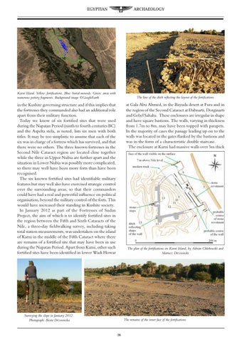in the Kushite governing structure and if this implies that the fortresses they commanded also had an additional role apart from their military function. Today we know of six fortified sites that were used during the Napatan Period (ninth to fourth centuries BC) and the Aspelta stela, as noted, lists six men with both titles. It may be too simplistic to assume that each of the six was in charge of a fortress which has survived, and that there were no others. The three known fortresses in the Second Nile Cataract region are located close together while the three in Upper Nubia are further apart and the situation in Lower Nubia was possibly more complicated, so there may well have been more forts than have been recognised. The six known fortified sites had identifiable military features but may well also have exercised strategic control over the surrounding areas, so that their commanders could have had a real and powerful influence on political organisation, beyond the military control of the forts. This would have increased their standing in Kushite society. In January 2012 as part of the Fortresses of Sudan Project, the aim of which is to identify fortified sites in the region between the Fifth and Sixth Cataracts of the Nile, a three-day fieldwalking survey, including taking total station measurements, was undertaken on the island of Karni in the middle of the Fifth Cataract where there are remains of a fortified site that may have been in use during the Napatan Period. Apart from Karni, other such fortified sites have been identified in lower Wadi Howar